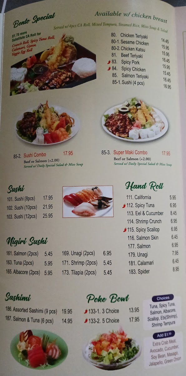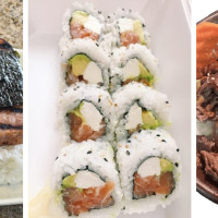 In: Deep fried albacore, crab meat, avocado. Out: baked salmon, spicy tuna.