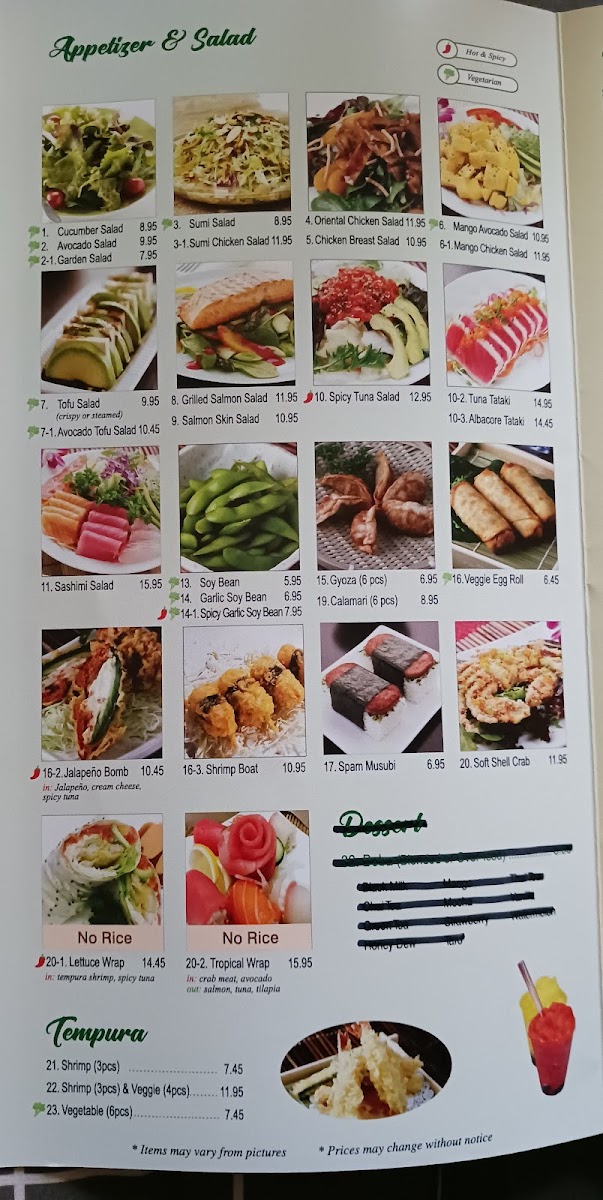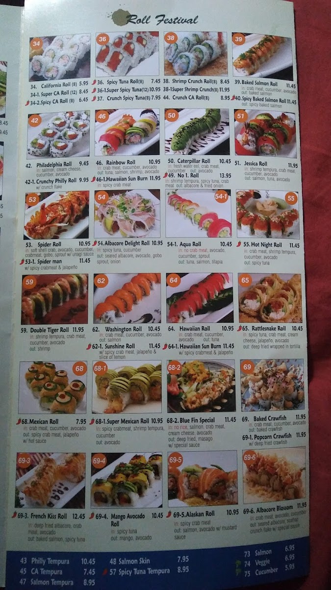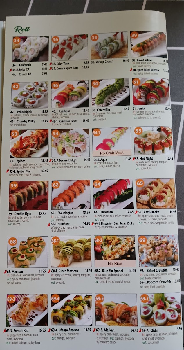 In: crab meat, cucumber, avocado out: spicy crab meat, jalapeno w/ hot sauce.